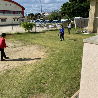 園庭でバトミントン(羽根つき)にチャレンジ